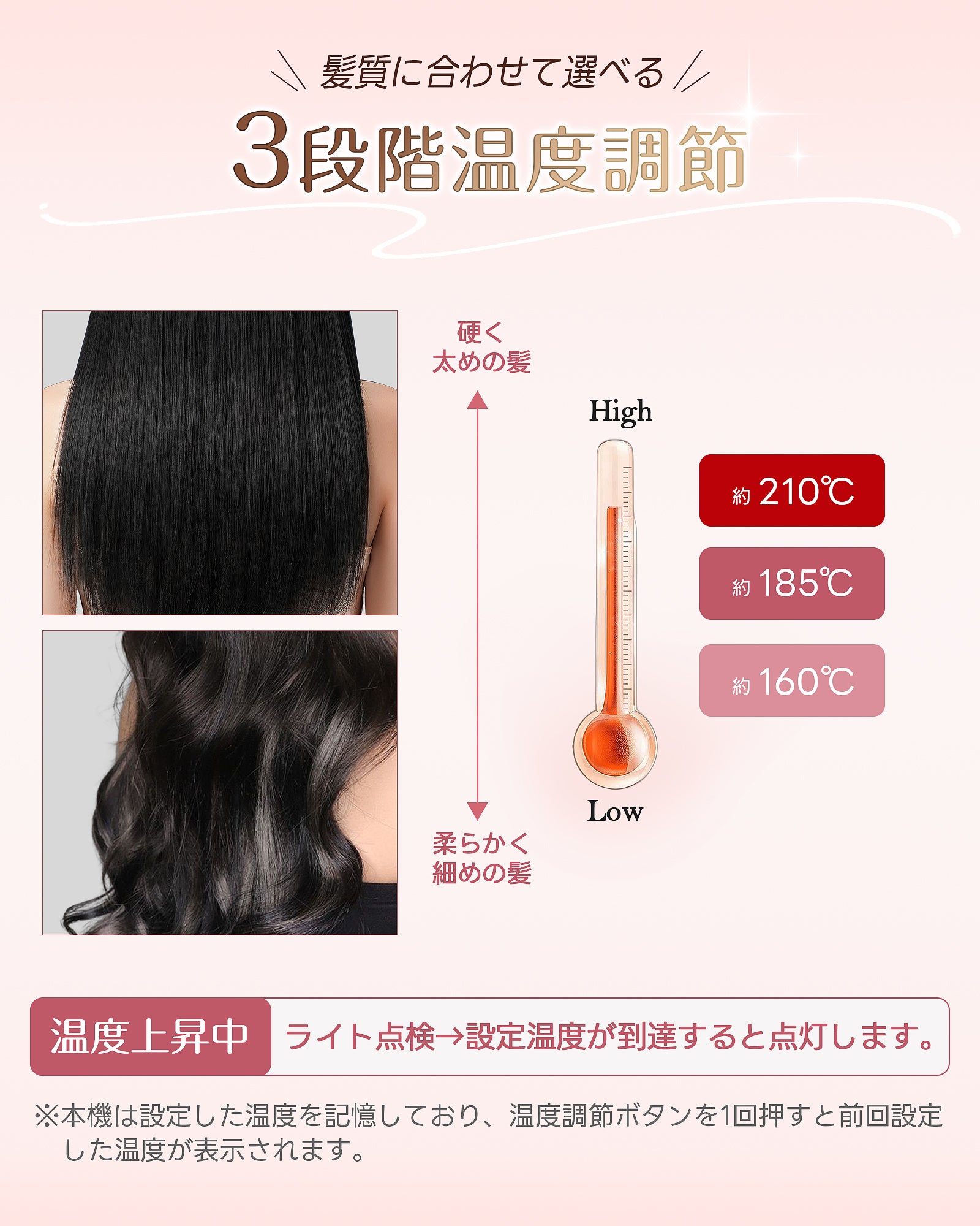 160℃、185℃、210℃の3段階温度調節が可能で、柔らかい髪から硬い髪まで幅広く対応。いつでもどこでも理想のヘアスタイルを実現!