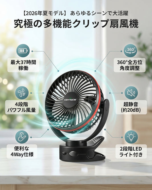 【Keynice卓上とクリップ扇風機】卓上とクリップ扇風機 静音 4段階風量 LEDライト 上下左右に360°回転 KN-871