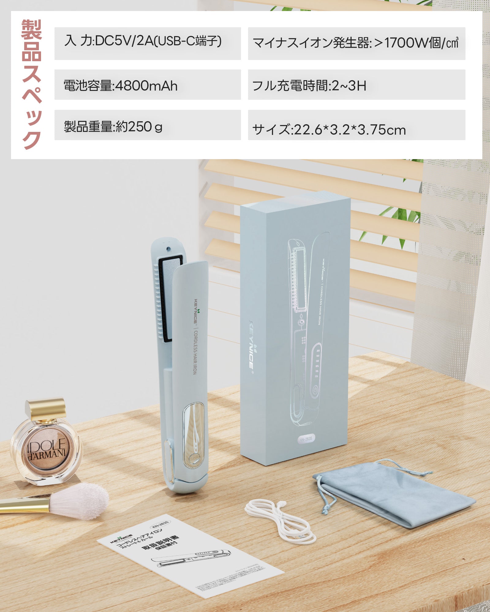 Keynice コードレスヘアアイロン マイナスイオン搭載 静電気抑制 ミニ ストレート&カール 2way メンズ対応 4800mAh 充電式 ワイヤレス コンパクト 携帯用 3段階温度調節 前髪用 収納ポーチ付き KN-2635