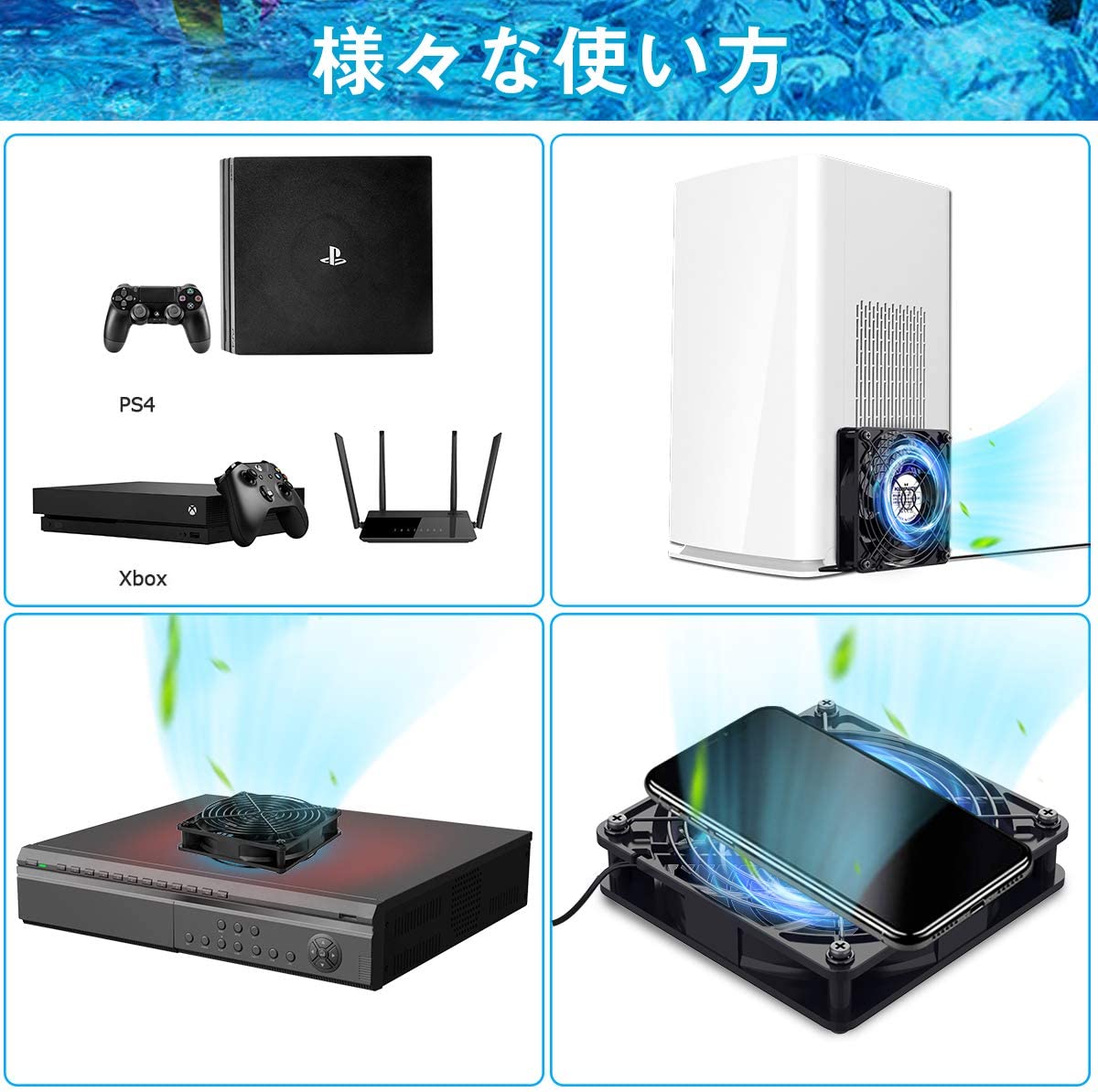 - This cooling fan is designed to cool electronic devices such as external HDDs, routers, AV devices, smartphones, PS4 game consoles, etc., and prevents heat runaway caused by heat buildup in the circuit board. As a desk fan, it can also be used for sleeping in the car or for air circulation.
