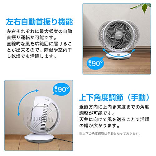 - ❉彡 [Automatic swing & efficient air circulation] The circulator can swing automatically up to 45 degrees to the left and right. Since it can deliver linear wind over a wide area, it is also useful for dehumidification and indoor drying. In addition, the angle can be adjusted vertically up to 90 degrees. By sending air toward the ceiling, you can expand your range of activities. *Vertical angle adjustment is manual.