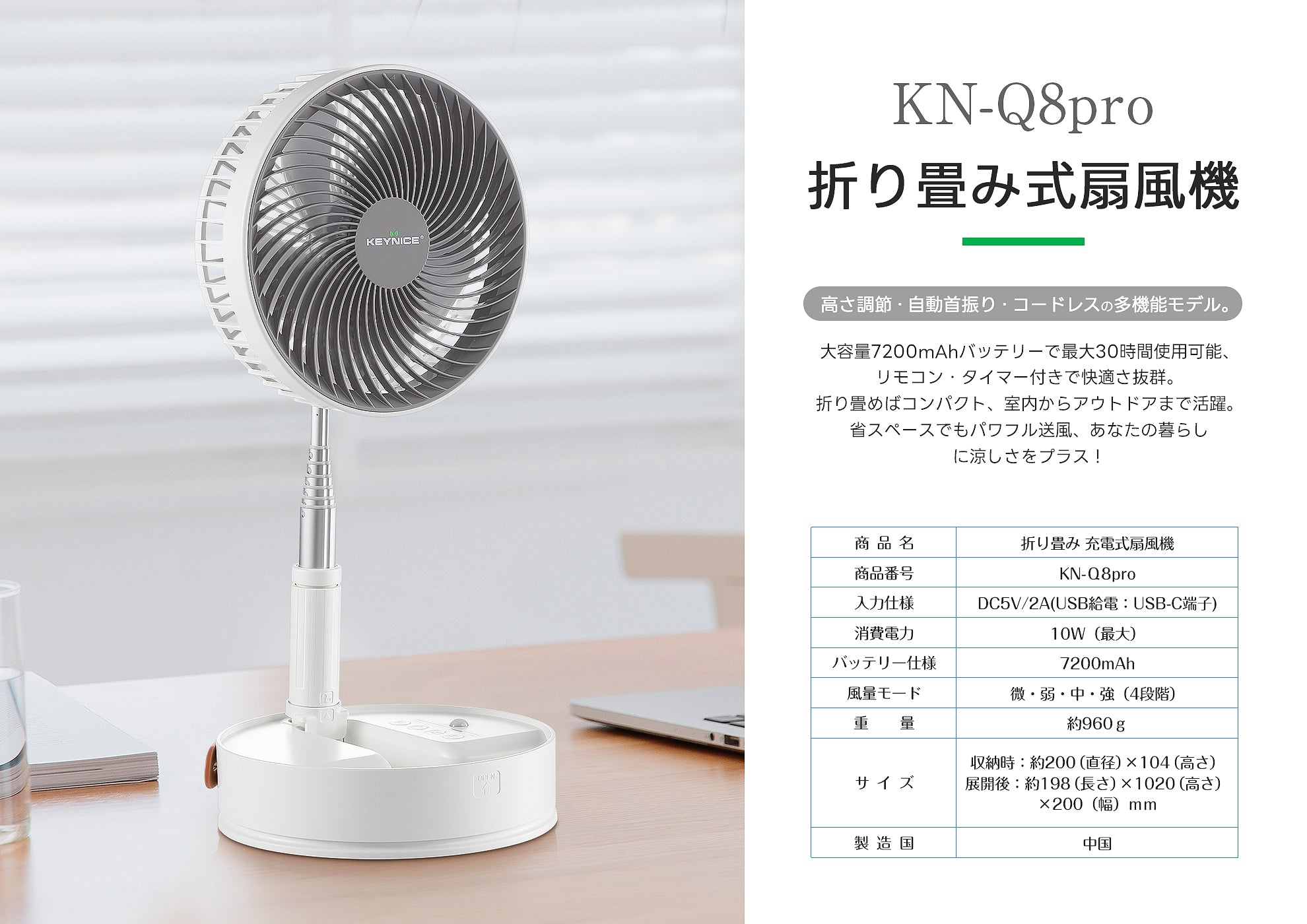 Foldable telescoping fan oscillating timer living room rechargeable 7200mAh with remote control KN-Q8 pro