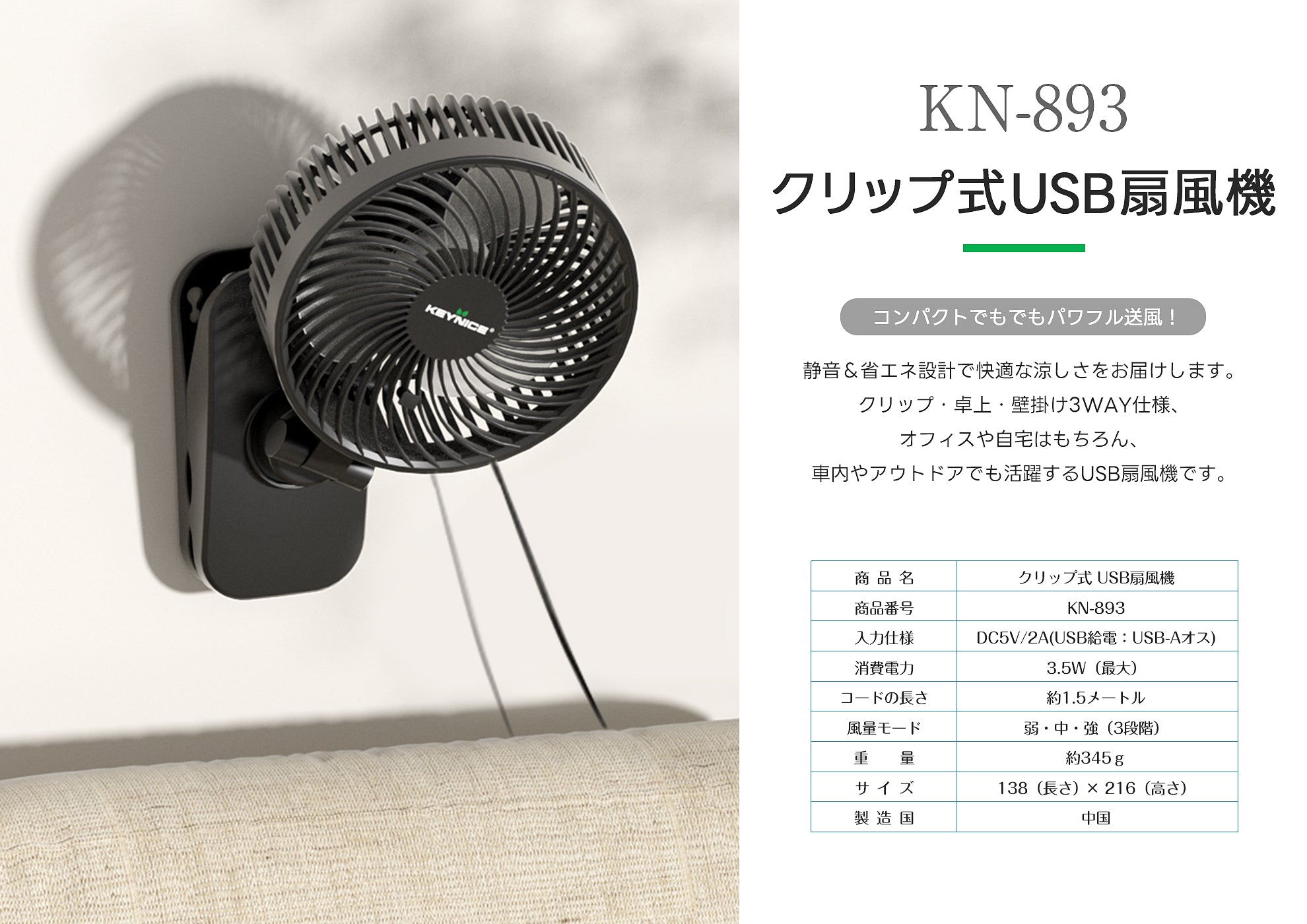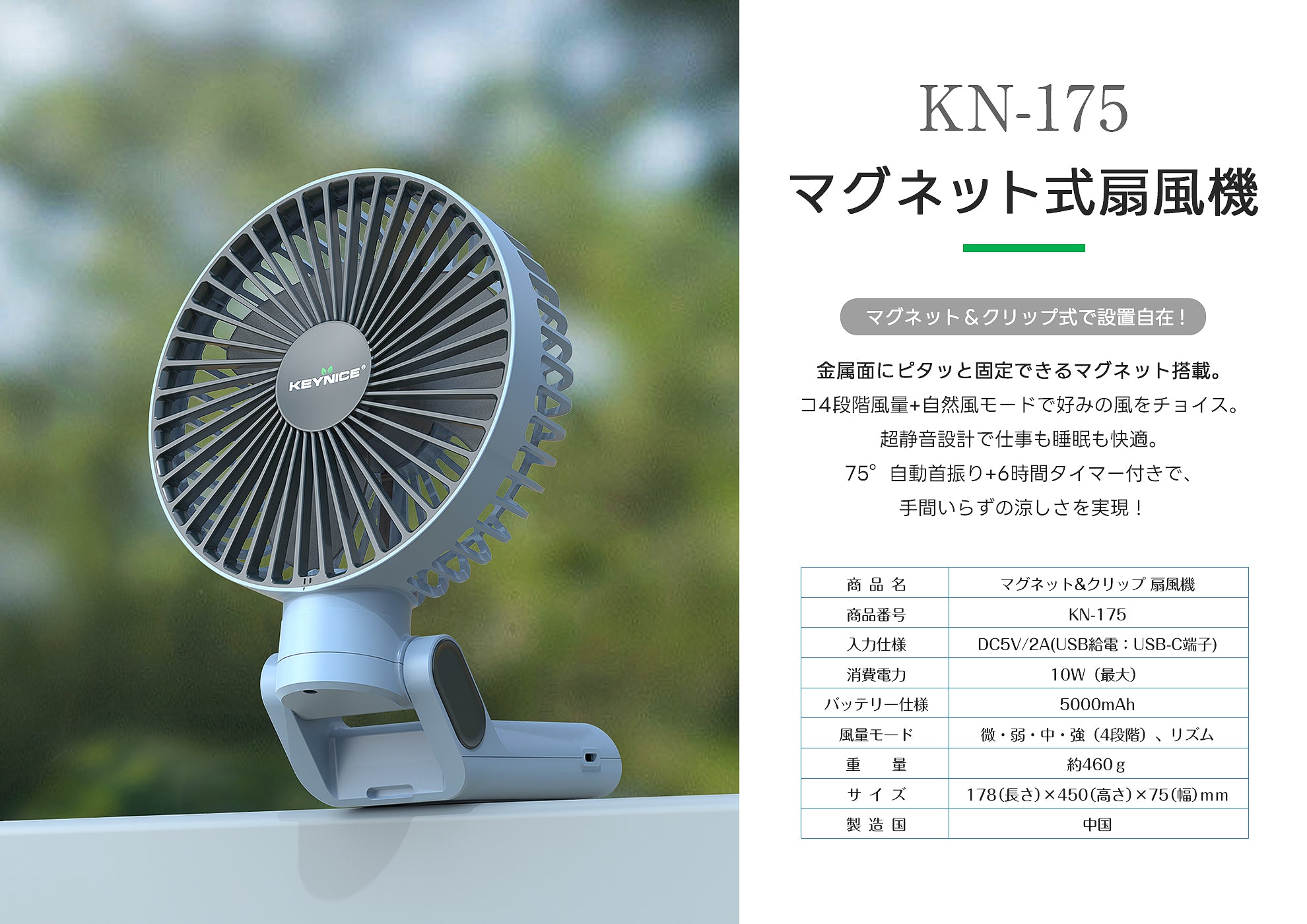 マグネット式充電扇風機|首振り&クリップ分離型|多機能KN-175
