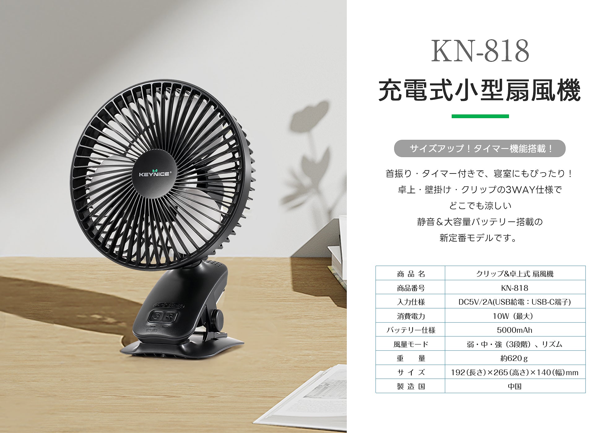 [Very Popular] Clip and Tabletop Fan, Oscillating Head, Rechargeable, 3 Levels of Air Volume + Rhythm, Timer Function KN-818